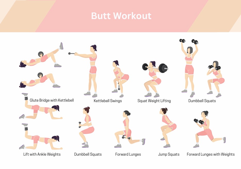 9 Butt Workout Toning Exercises with Kettlebells Dumbbell Ankle Weights poster plus instructions, 4 pages. Including following exercises: Glute Bridge with Kettlebell, Kettlebell Swings, Squat Weight Lifting, Dumbbell Squats, Lift with Ankle Weights, Dumbbell Squats, Forward Lunges, Forward Lunges with Weights and Jump Squats.